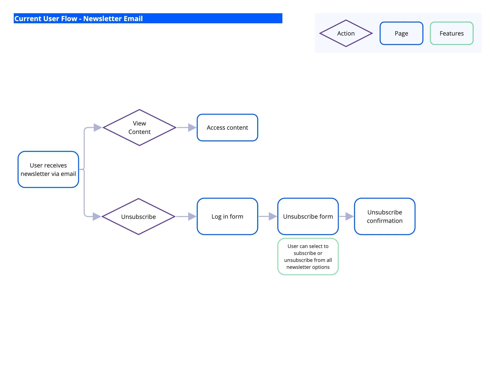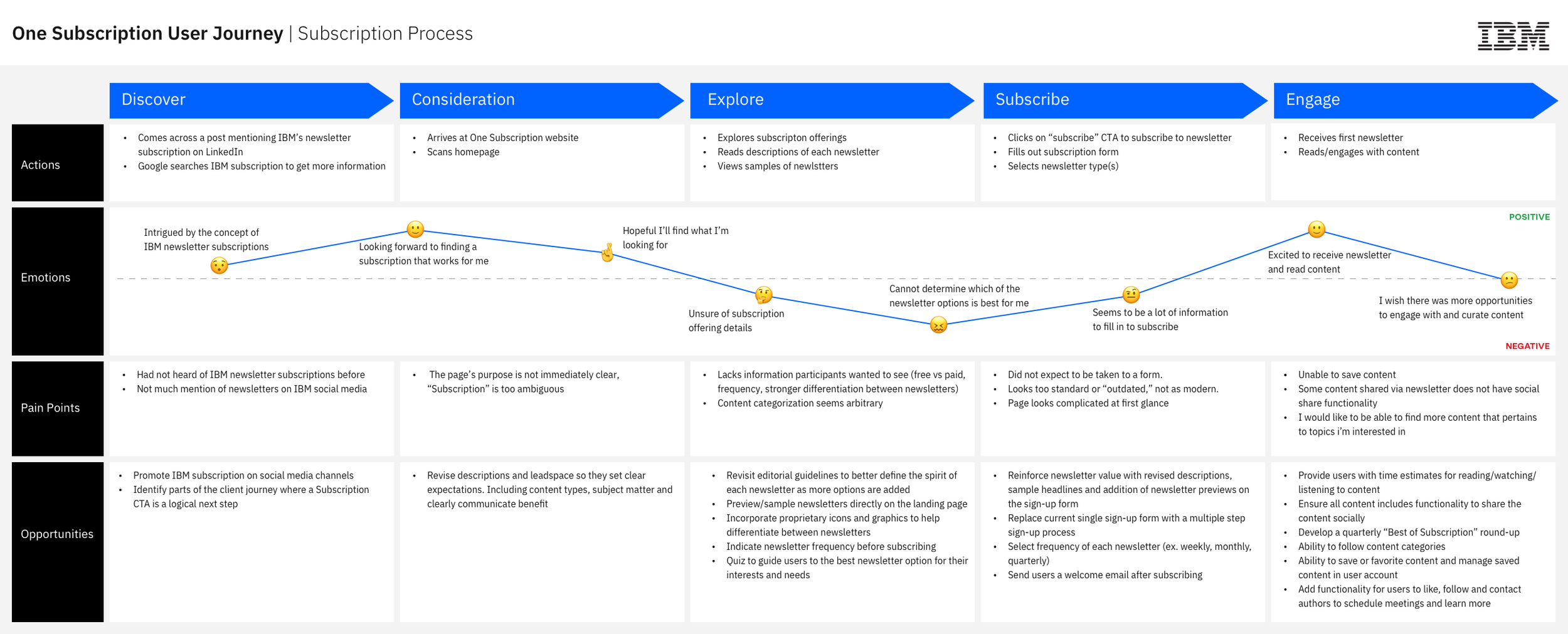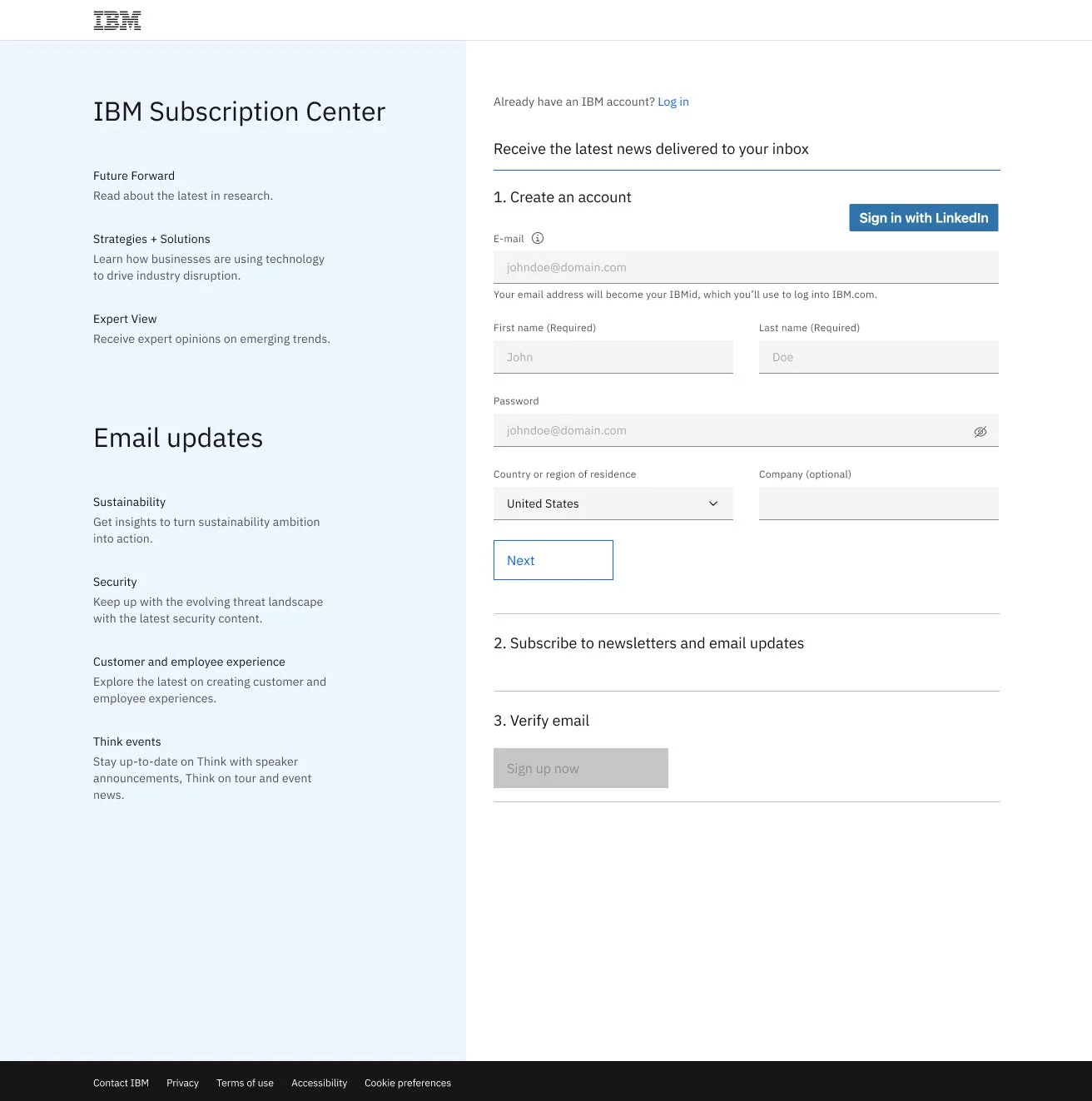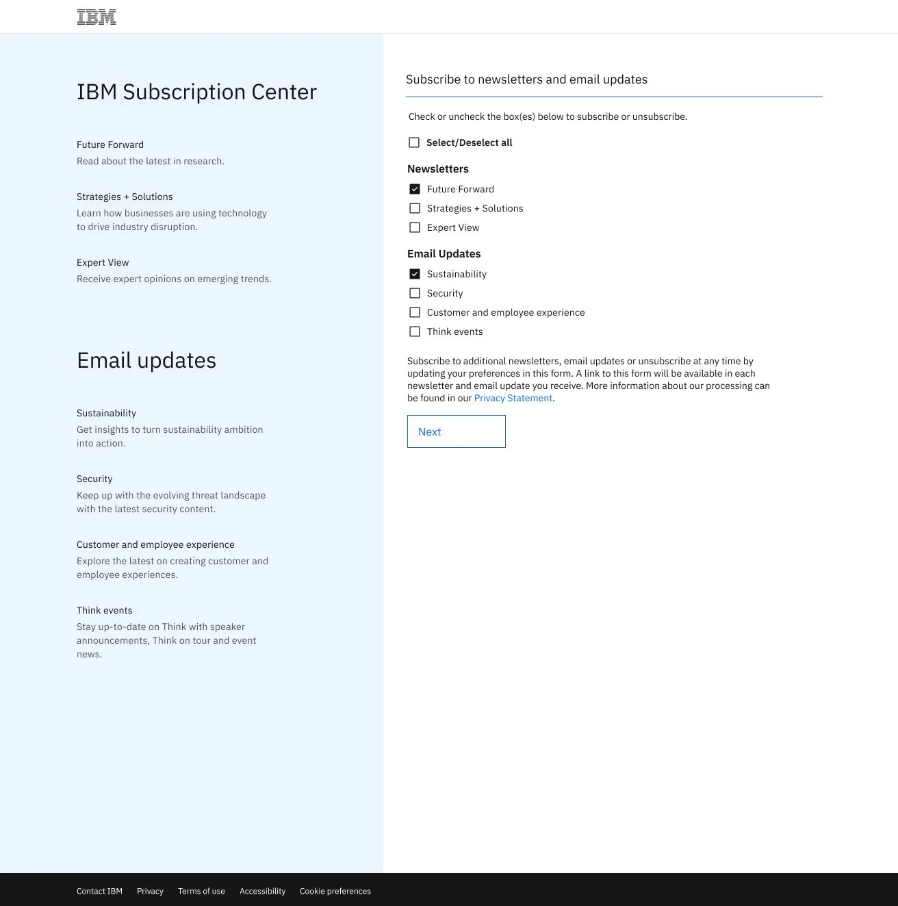 IBM expanded their newsletter subscription offerings and approached our team to redesign the subscription journey for both logged-in users with IBM accounts and new users without one. We were presented with an exciting challenge: what was once a simple process of subscribing to a single newsletter would no longer be sufficient. We wanted to allow users to select a unique combination of newsletters tailored to their interests and needs, while keeping the journey simple and streamlined to avoid drop-off along the way.