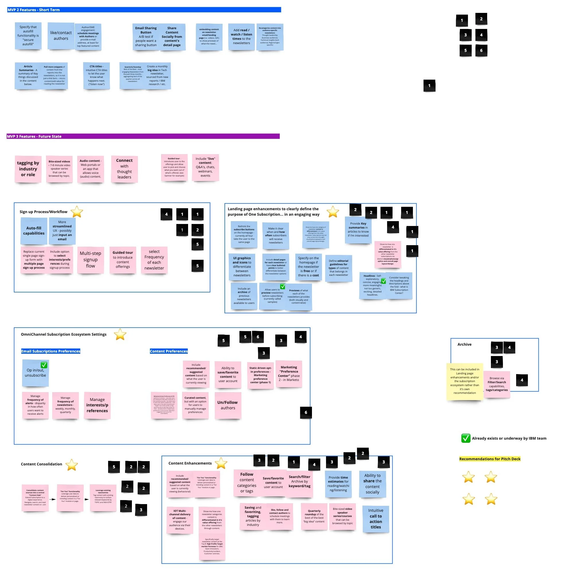 Our team conducted a workshop to understand the current and desired process, pain points, and key functionality. We designed a solution for email subscription and mapped out a future-state experience featuring a more robust user hub — one that would allow users to manage their profile and discover, save, and share IBM content.
