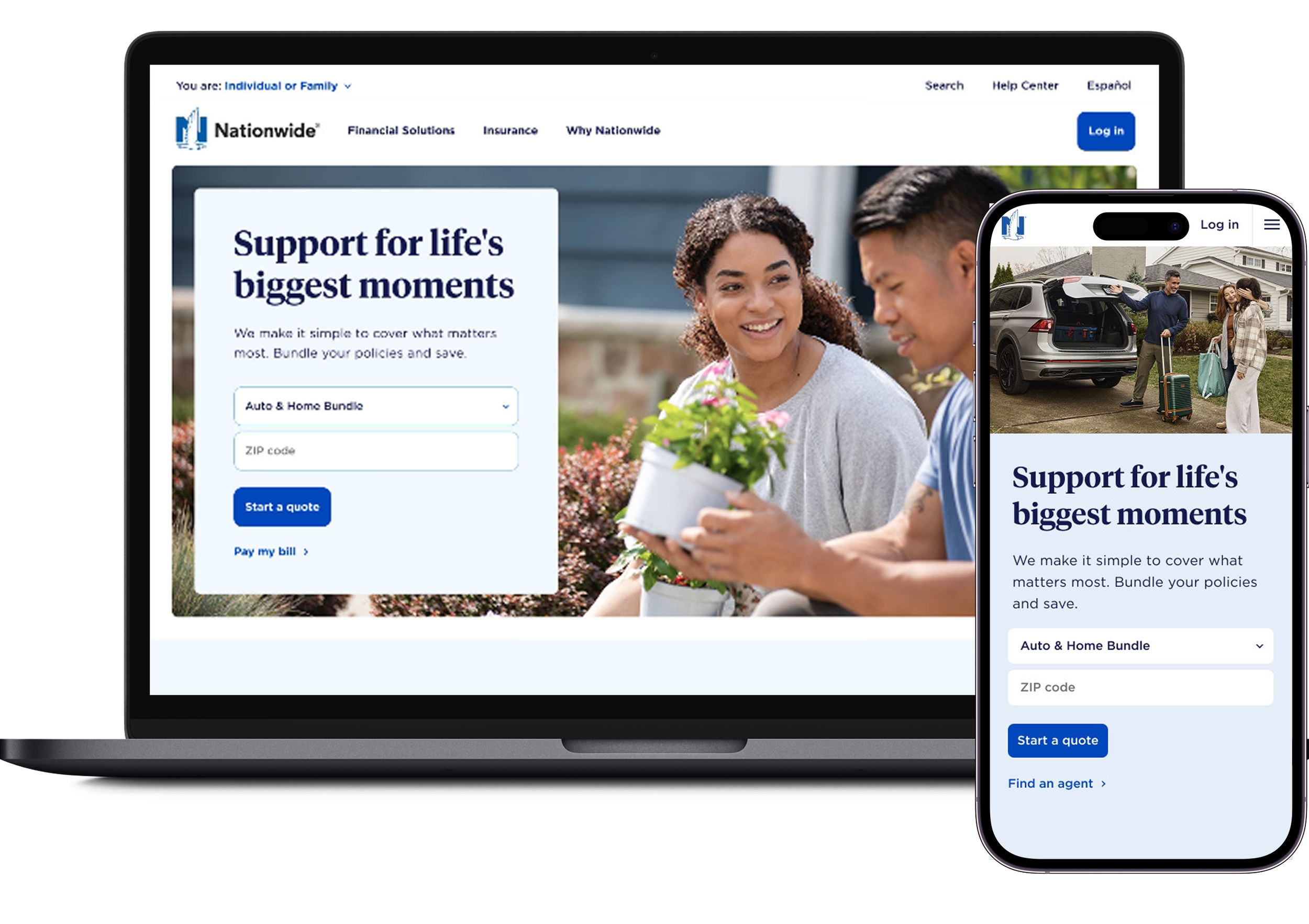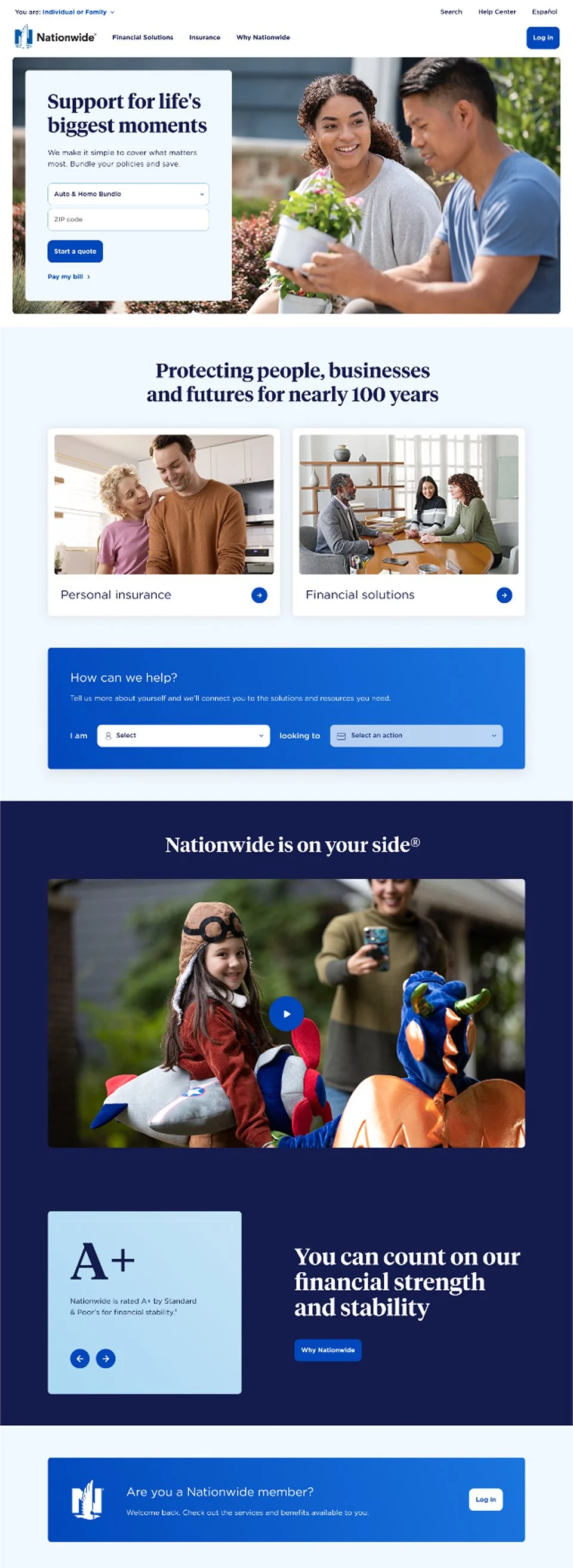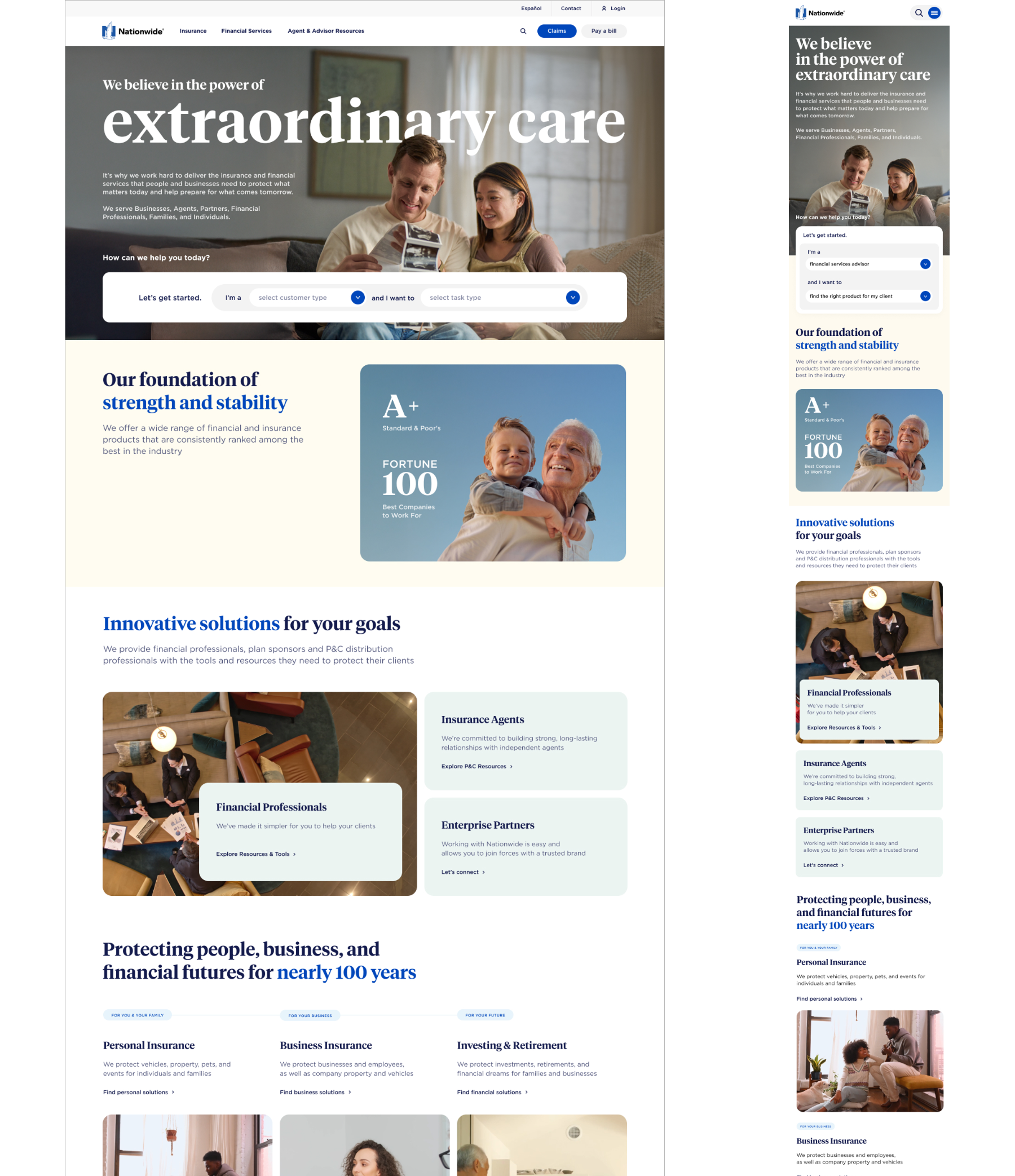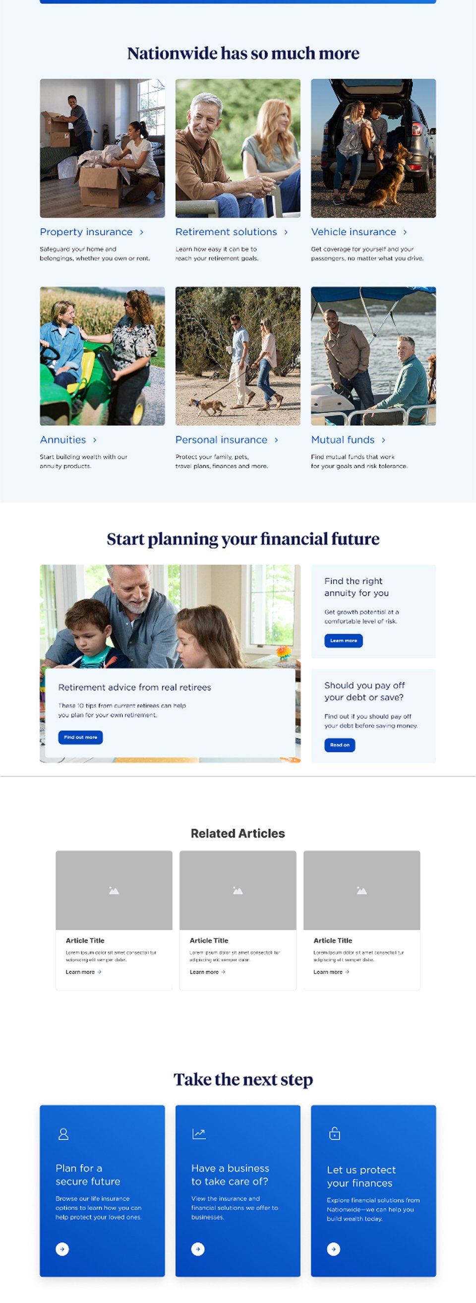 As Design Director for the Nationwide pitch, I led a small team through a fast-paced process to build a compelling case for their homepage redesign. That meant high-fidelity mockups and a clickable prototype delivered under a tight deadline. The design stayed true to Nationwide's brand guidelines while pushing toward a cleaner, more modern aesthetic. My role covered both the creative direction and managing junior designers, keeping the work focused and the quality high throughout. We won the account.